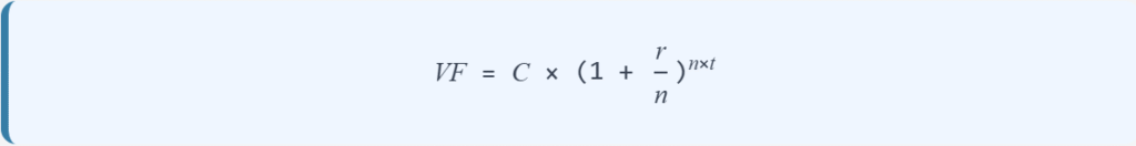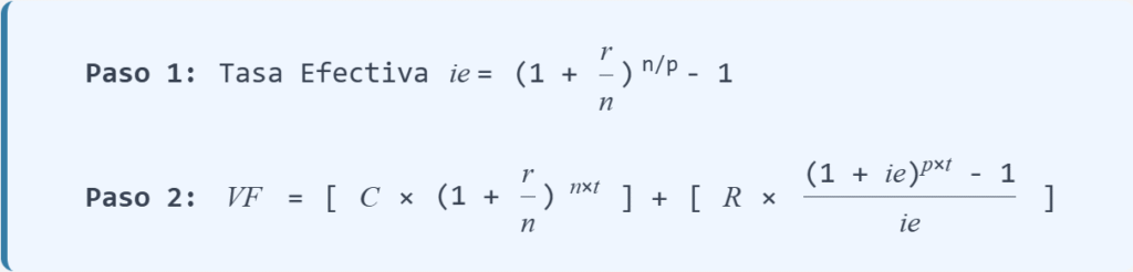 Es la fórmula más precisa cuando la frecuencia de tus aportes (p) es diferente a la frecuencia de capitalización del banco (n).