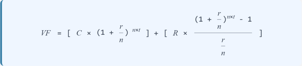 Se aplica cuando realizas aportes (R) con la misma frecuencia que la capitalización de intereses (por ejemplo, aportes mensuales y capitalización mensual).